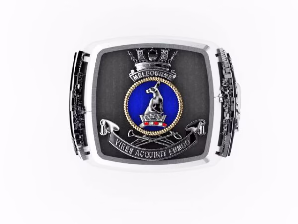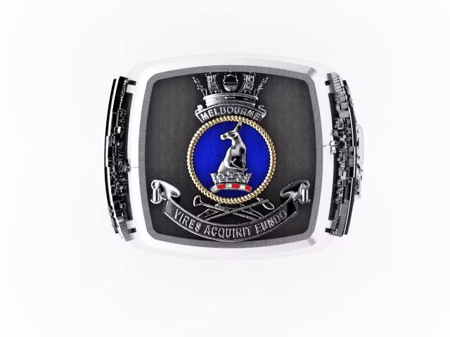HMAS Melbourne Ships Crest Ring Crest Ring is made to order it will take around 14 days to make your ring. This ring has been made by our own skilled silversmith Artisan in our studio and the ring is 92.5 percent Sterling Silver. Emblem has had enamel color as well as Oxidized Silver.The face of the ring is 22mm high by 20mm wide and this ring has been backfilled for a comfort fit.