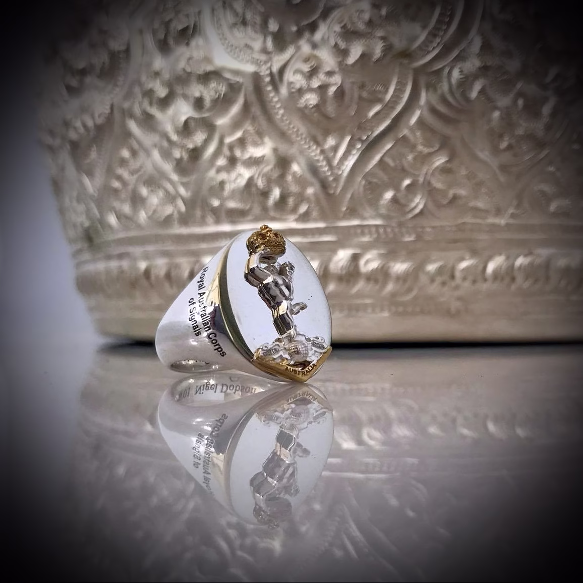 Measurements are 20mm high by 15mm wide on face of ring and is all sterling Silver d 92.5 percent and parts of emblem has been gold plated 5 micron best quality avalaible in market place.